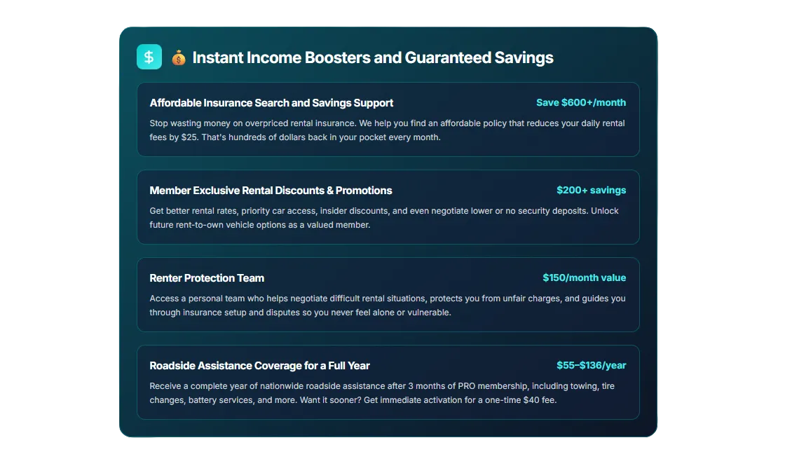 You get insurance savings, rental help, job offers, income tools, business formation, community, and career support all in one place for less than a tank of gas.