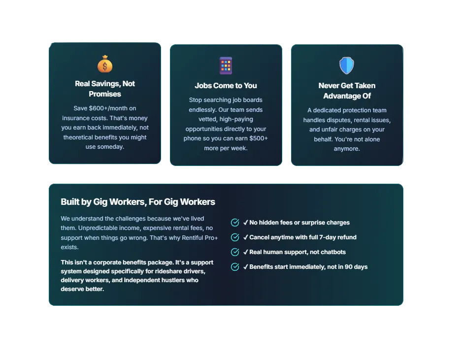 Rentiful.io was designed with one mission: give gig workers the power, support, and tools they never received from traditional employers or corporate platforms.